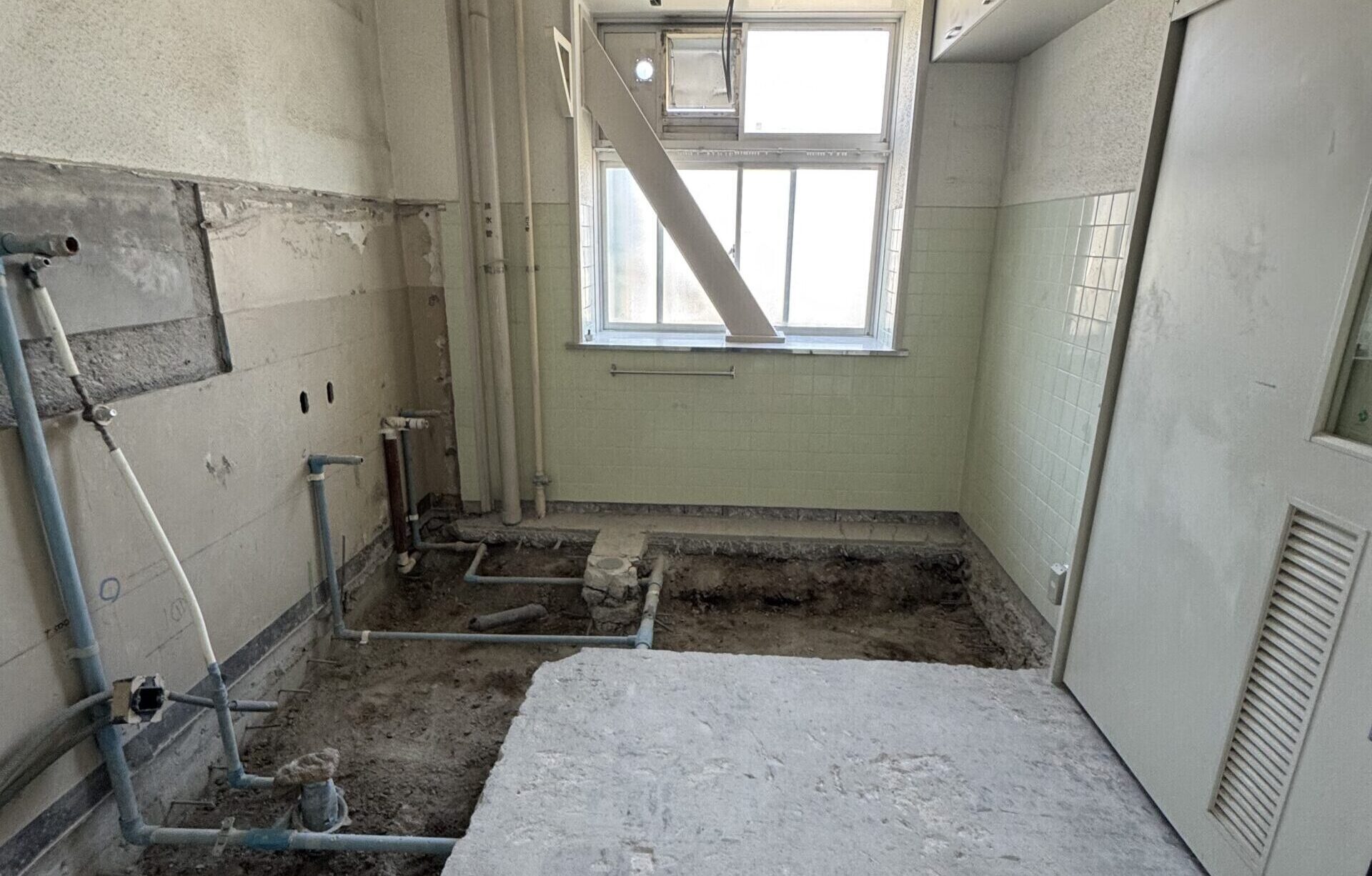 神奈川県の小学校トイレにて、床タイル・ライニング撤去・土間斫りを施工させて頂きました。仮囲い・養生内の斫り作業の際には熱中症対策、体制整備・…
