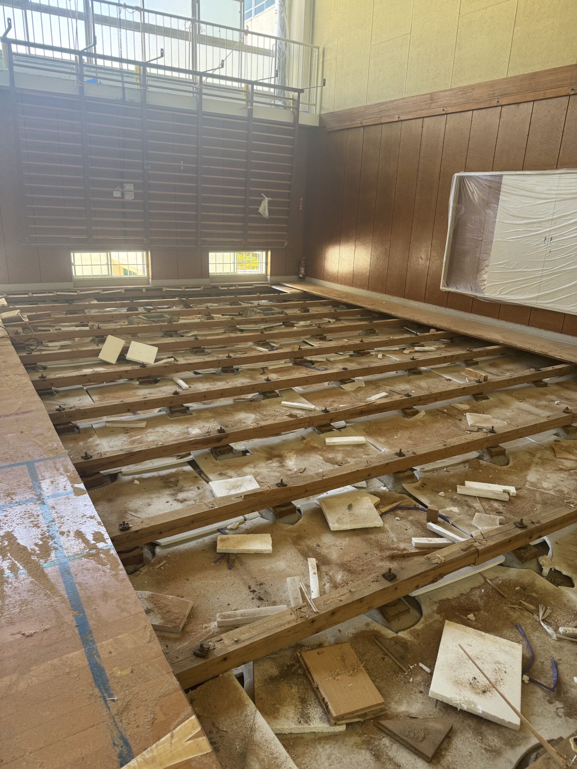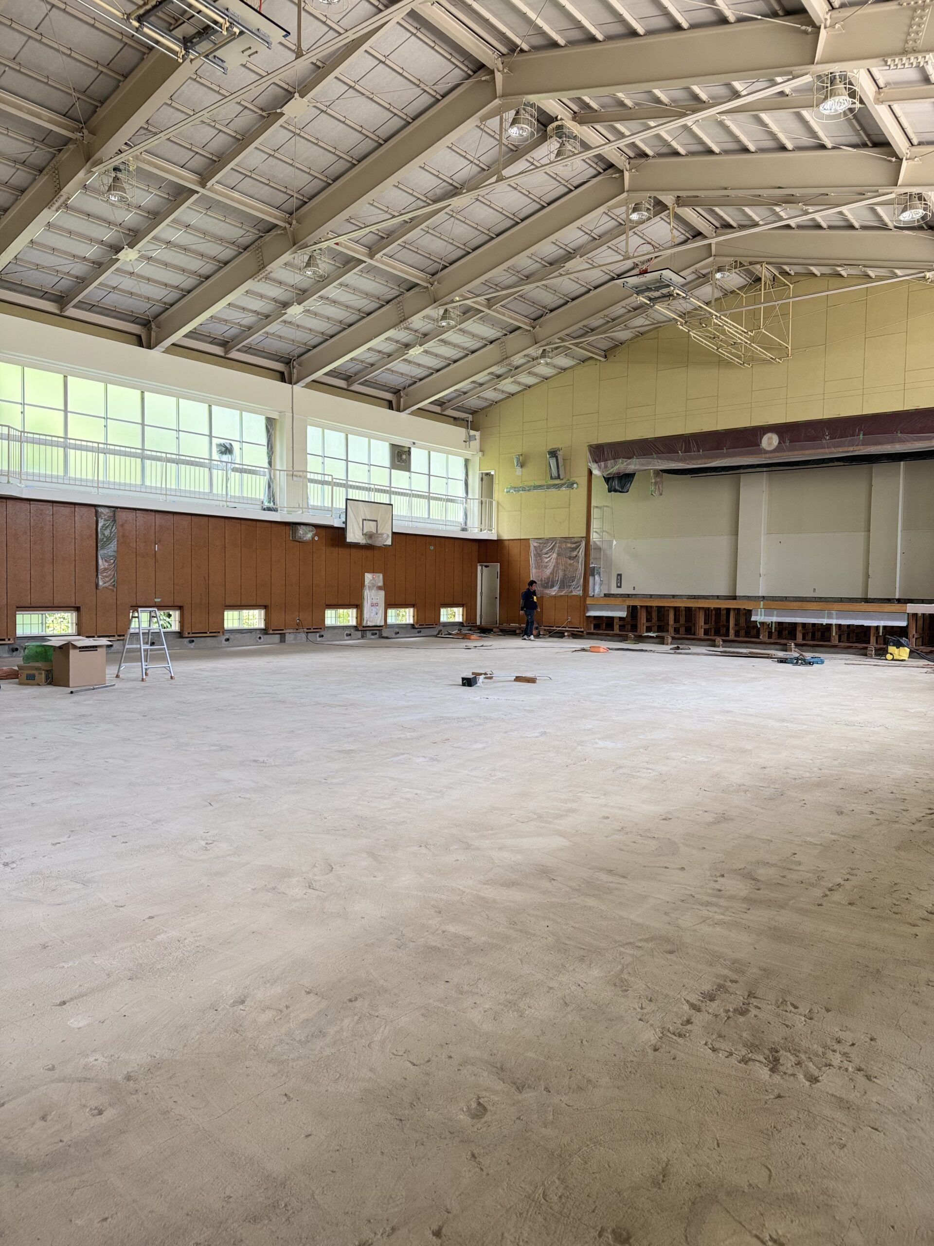 山に囲まれた自然豊かな小学校の体育館床改修工事を担当させて頂きました。7月の酷暑だった為、空調服を着用し定期的に水分補給や休憩をとって解体工事を行いました。さらに避暑室を設けて、熱中症対策を強化し体調不良者を出さずに工事を完了させる事ができました。