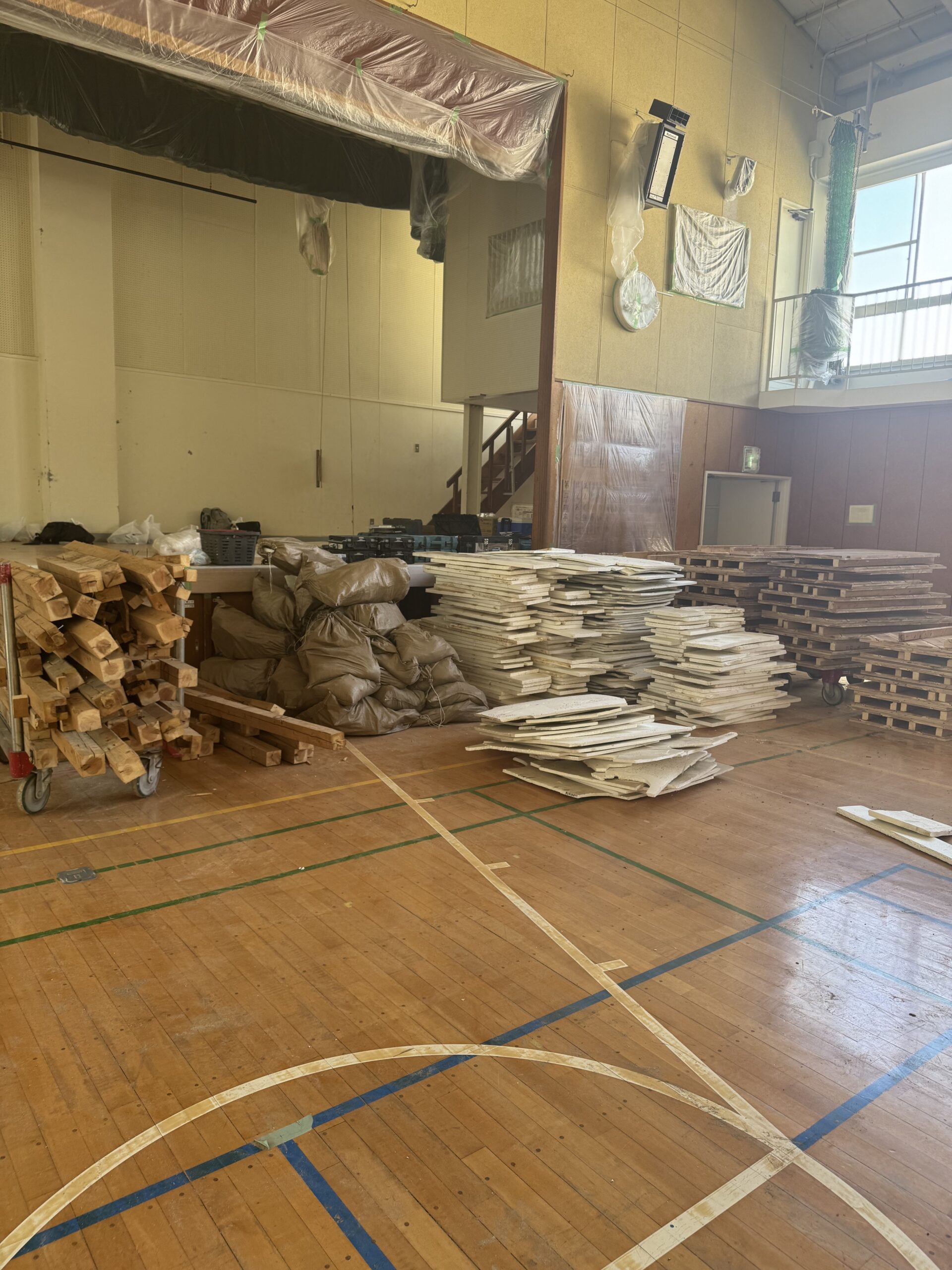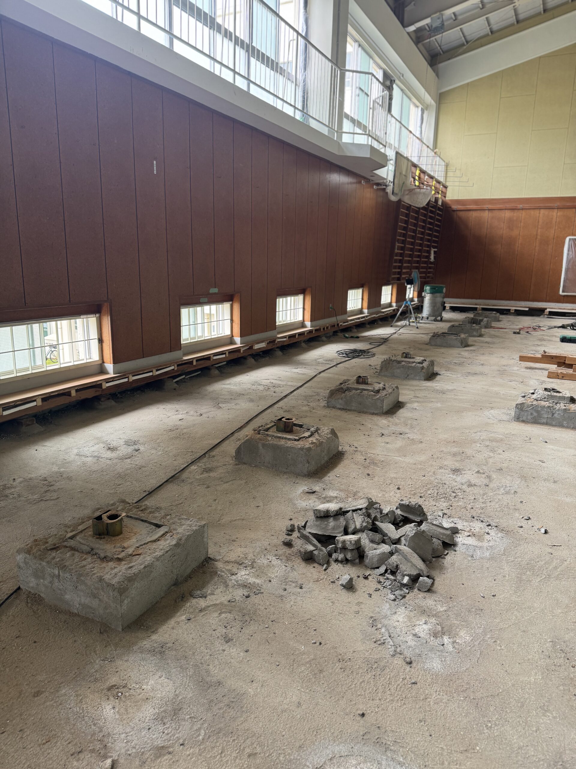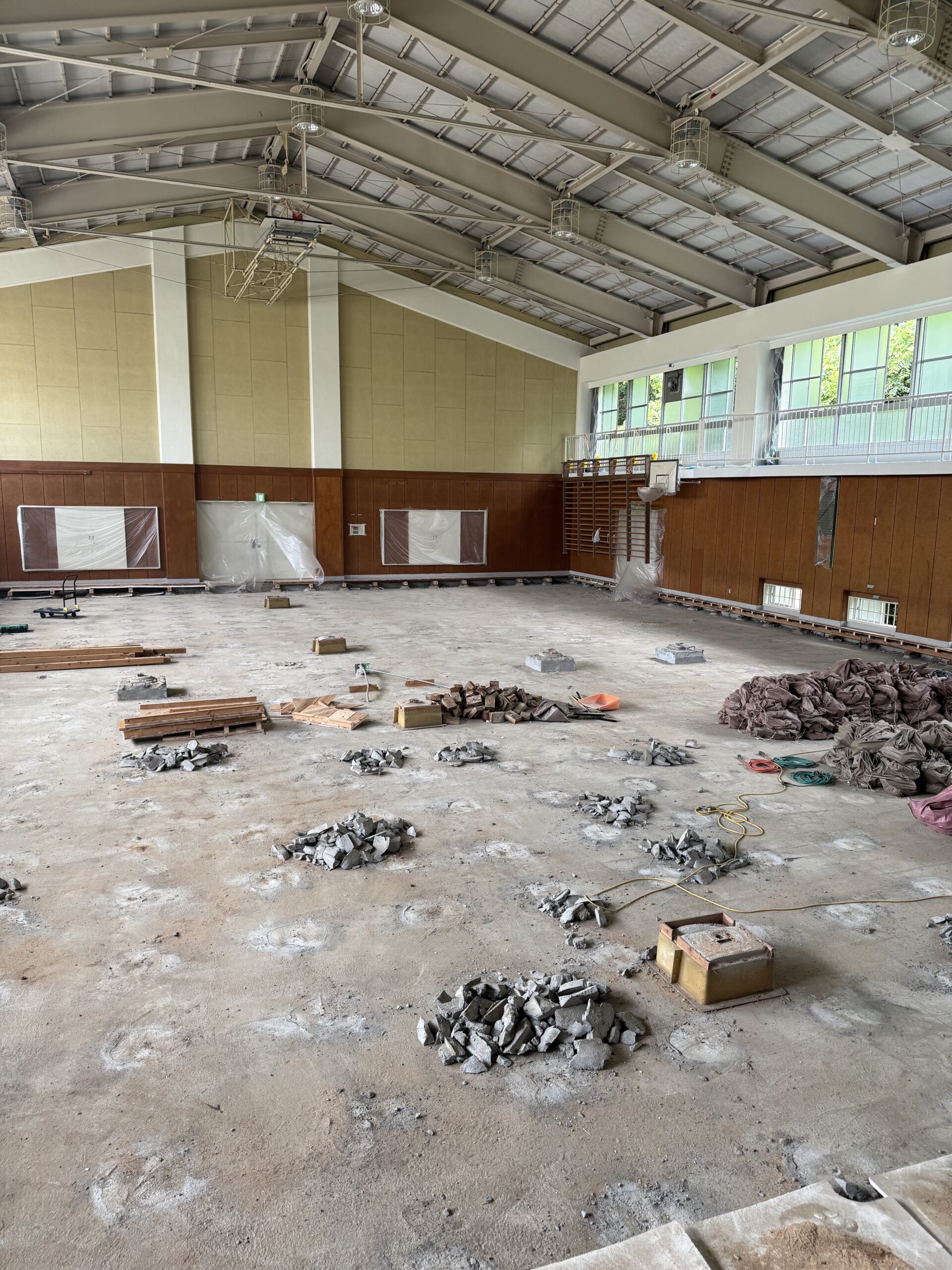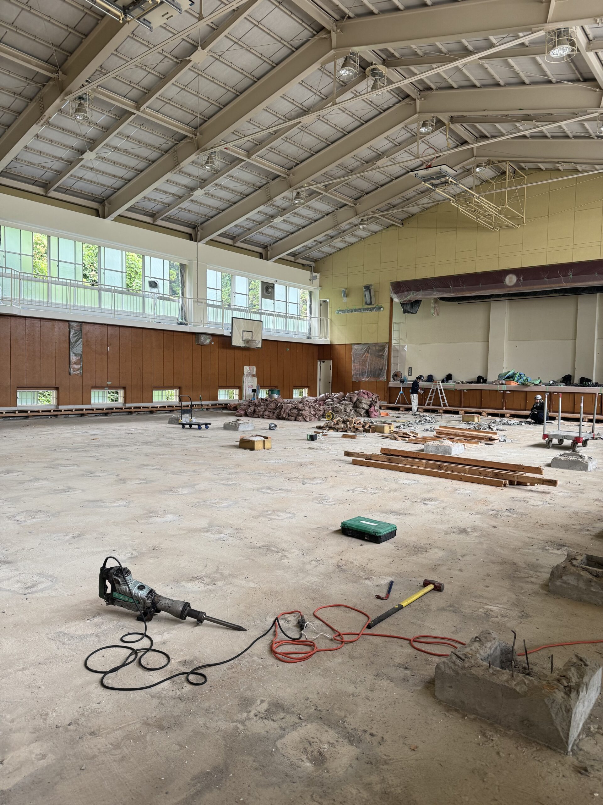 山に囲まれた自然豊かな小学校の体育館床改修工事を担当させて頂きました。7月の酷暑だった為、空調服を着用し定期的に水分補給や休憩をとって解体工…