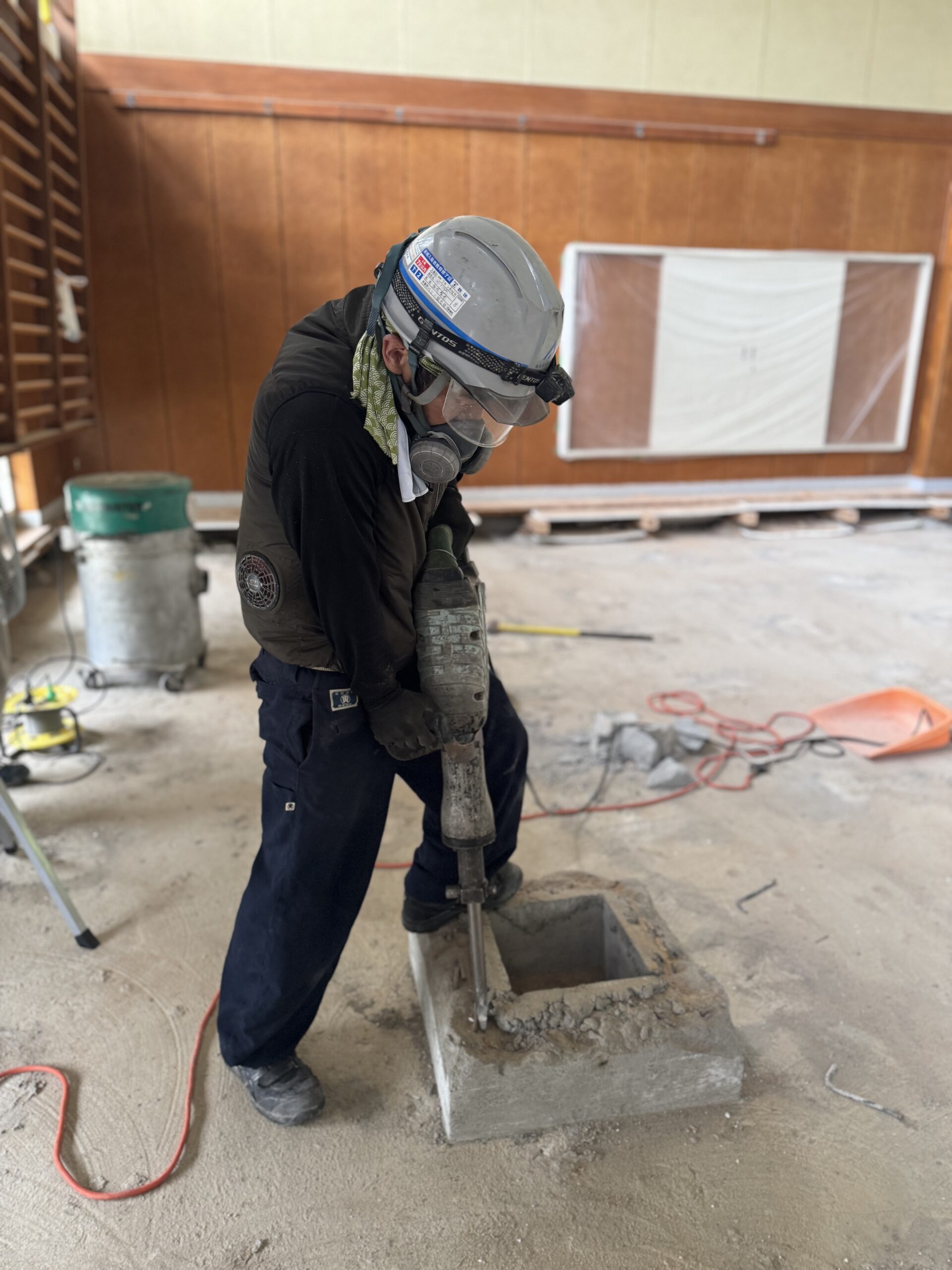 神奈川県にある小学校のトイレ改修工事を3箇所、担当させて頂きました。屋内解体の為、飛散防止をし集塵機を設置してコンプレッサーにて斫り工事を行…